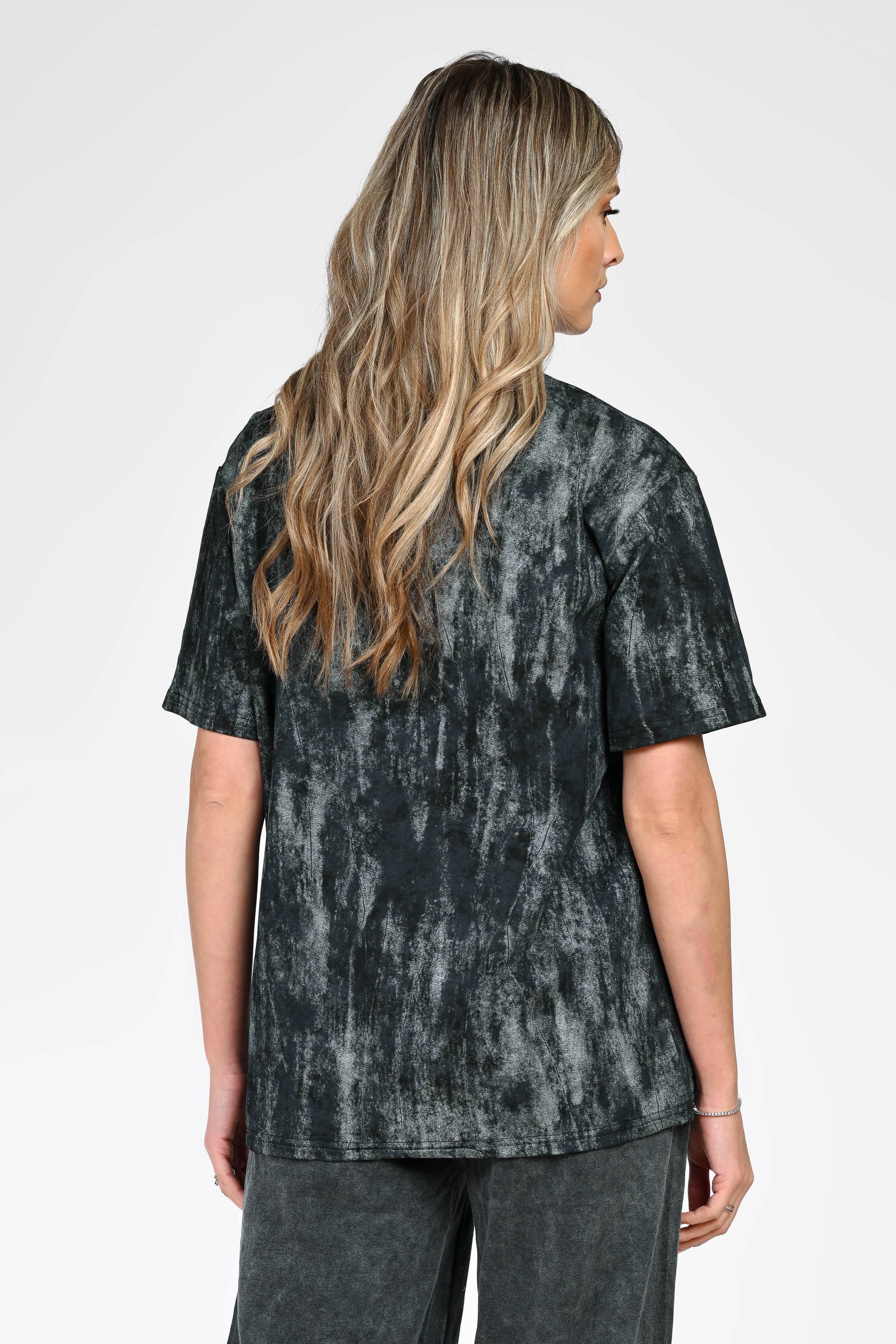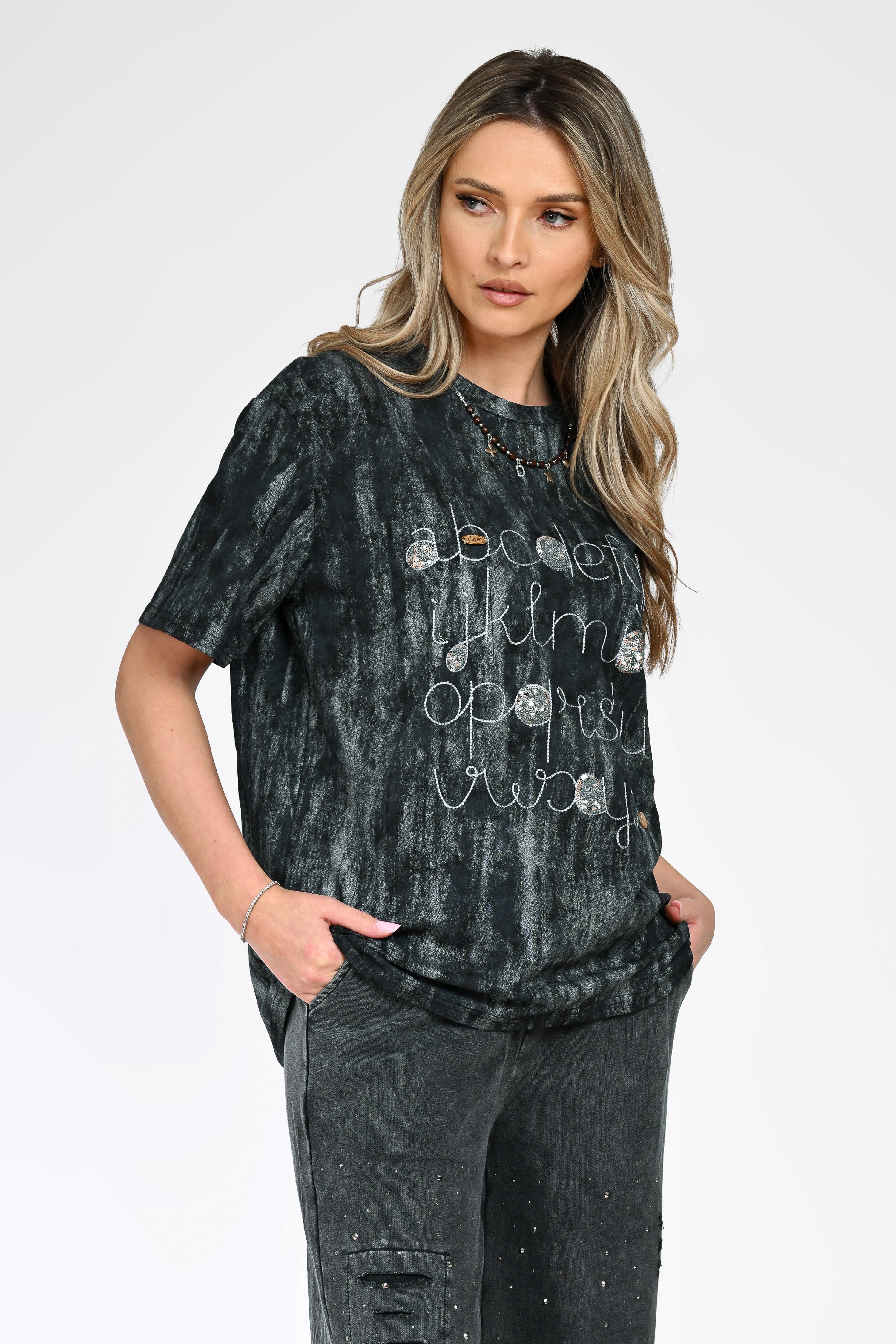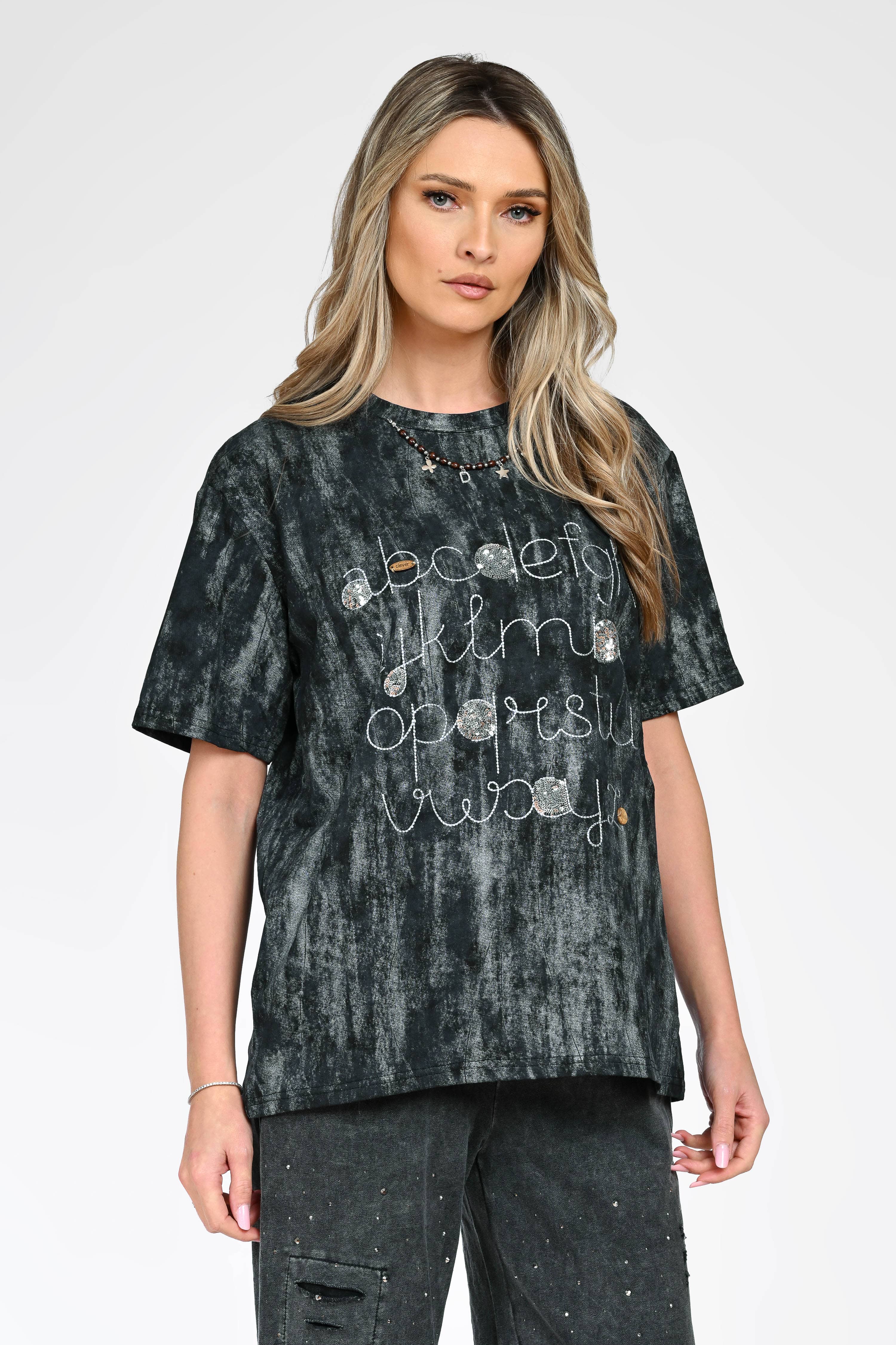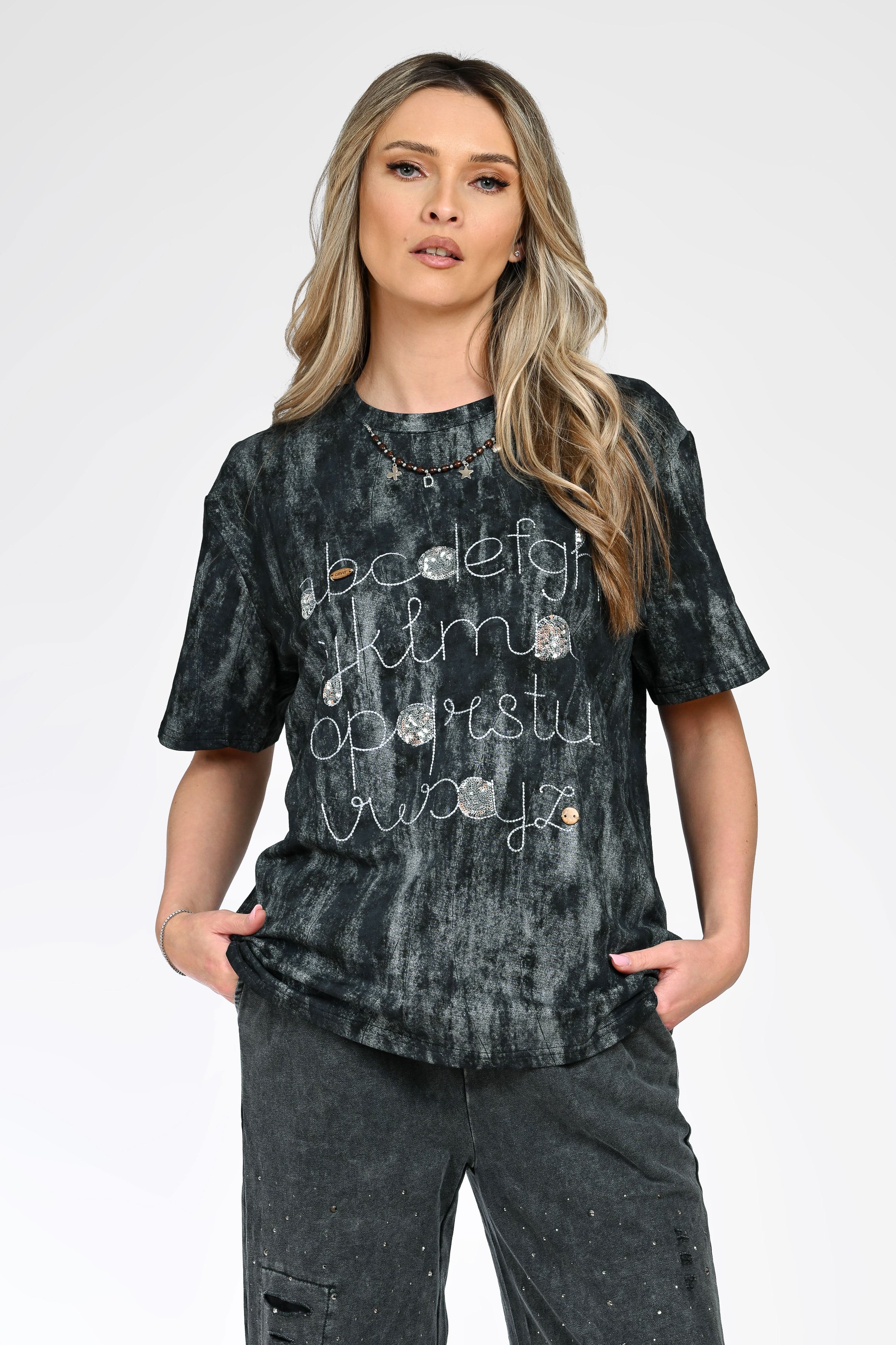 Designul cu efect prespălat oferă un aspect modern și ușor vintage, iar imprimeul text cu detalii decorative adaugă un plus de originalitate și stil. Croiala lejeră și mânecile largi contribuie la un look relaxat, inspirat din stilul urban contemporan.